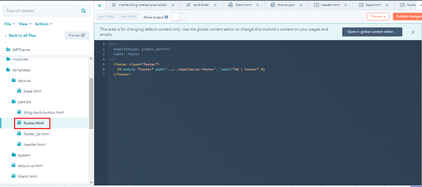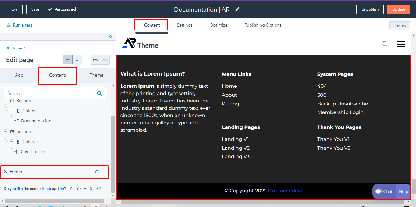 To edit your Footer, you'll first need to create a page with a theme template. When a page is created then edit you page in the left side click Tab Contents. Then click Page footer.