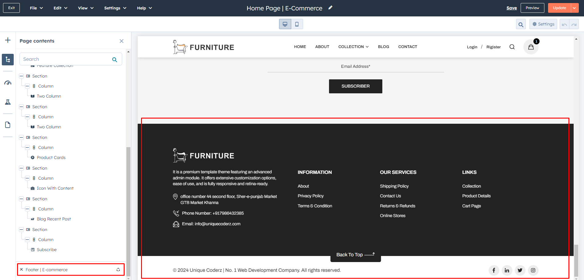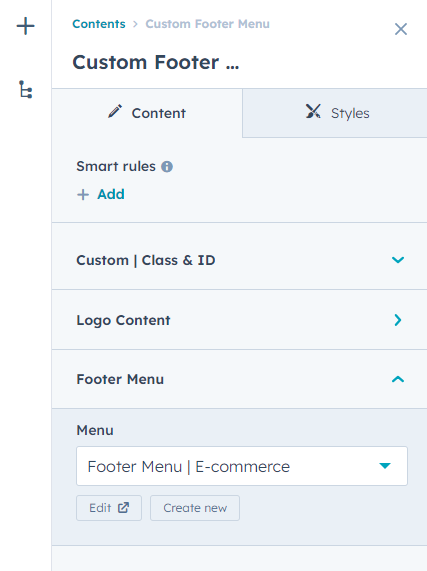 To edit your Footer, you'll first need to create a page with a theme template. When a page is created then edit you page in the left side click Tab Contents. Then click Page footer.