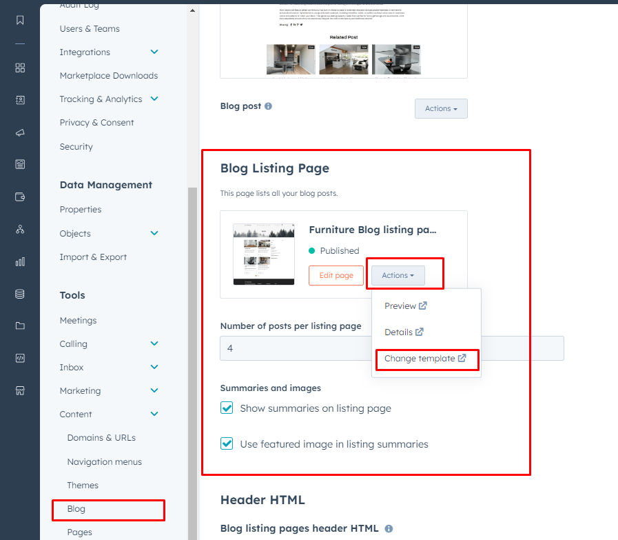 - In the Blog post and Blog listing sections, click the Actions dropdown menu to manage your template