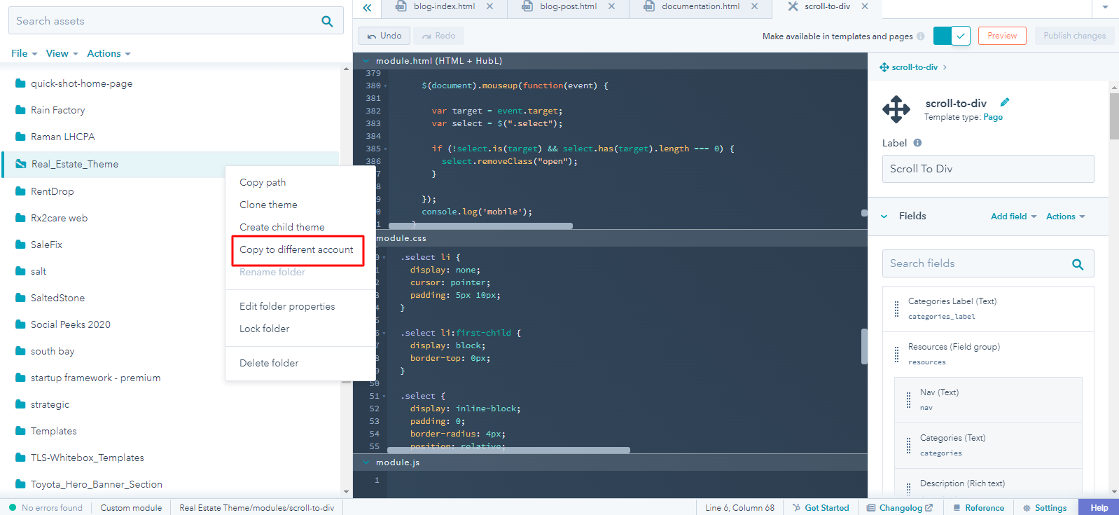 - In the Blog post and Blog listing sections, click the Actions dropdown menu to manage your template
