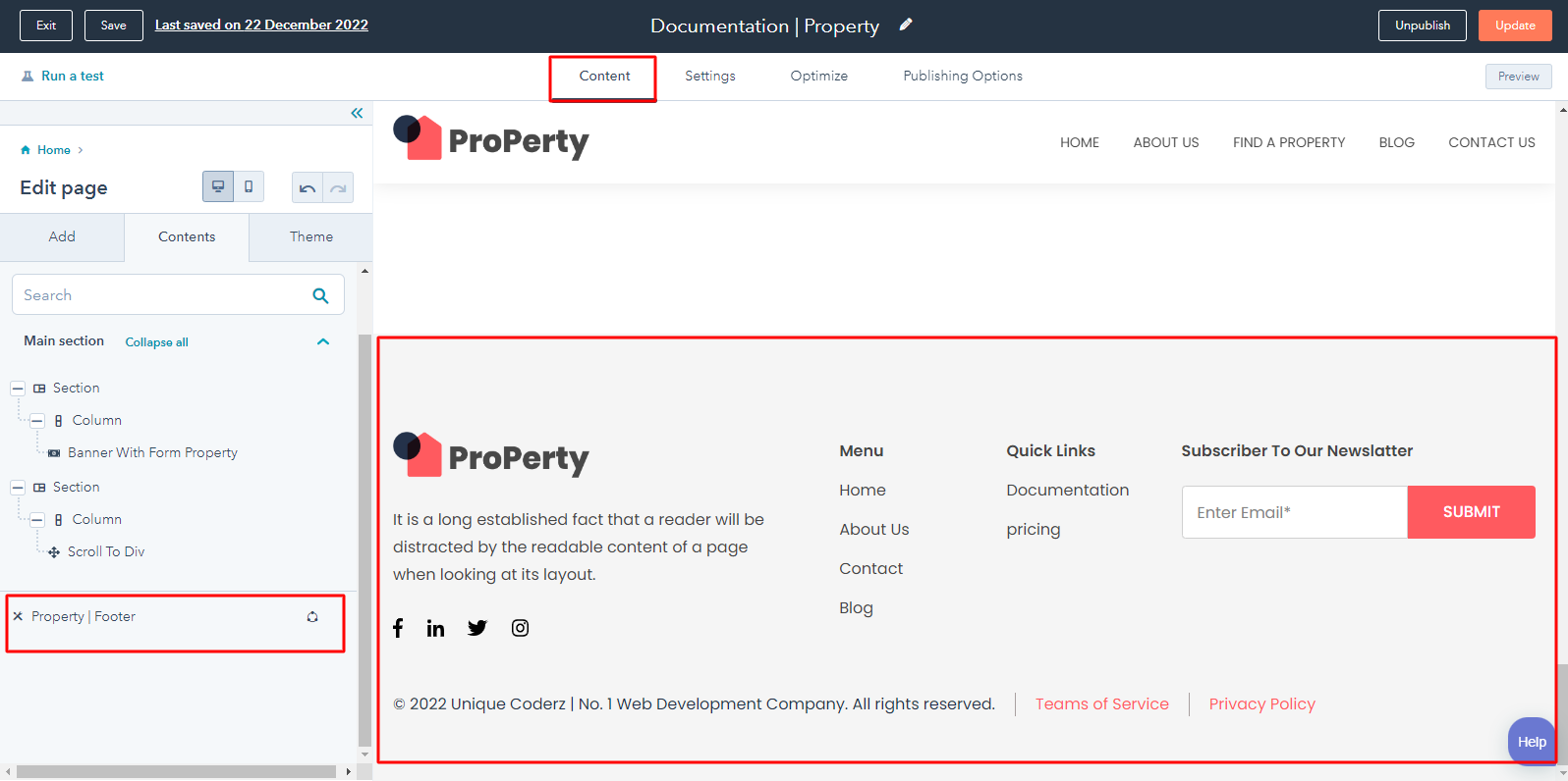 To edit your Footer, you'll first need to create a page with a theme template. When a page is created then edit you page in the left side click Tab Contents. Then click Page footer.