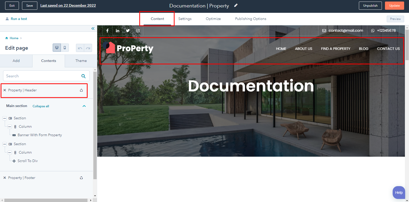 To edit your header, you'll first need to create a page with a theme template. When a page is created then edit you page in the left side click Tab Contents. Then click Page header.